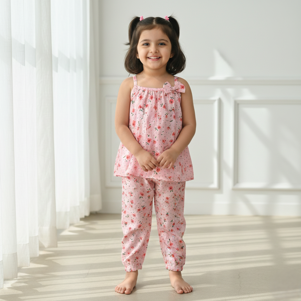 - This charming pink co-ord set includes a sleeveless strappy top paired with matching elasticated pants, designed for easy movement and all-day comfort.