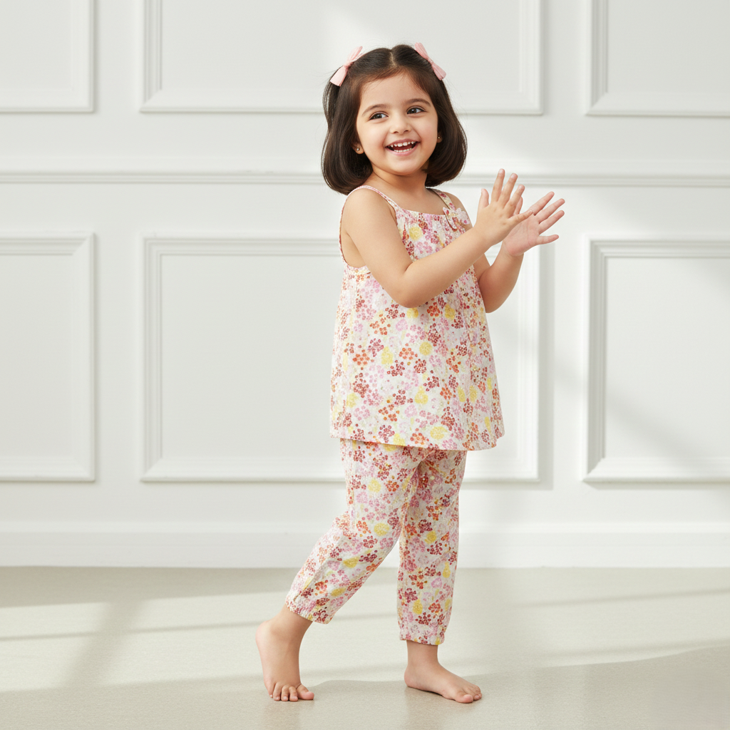 - This charming Pink co-ord set includes a sleeveless strappy top paired with matching elasticated pants, designed for easy movement and all-day comfort.