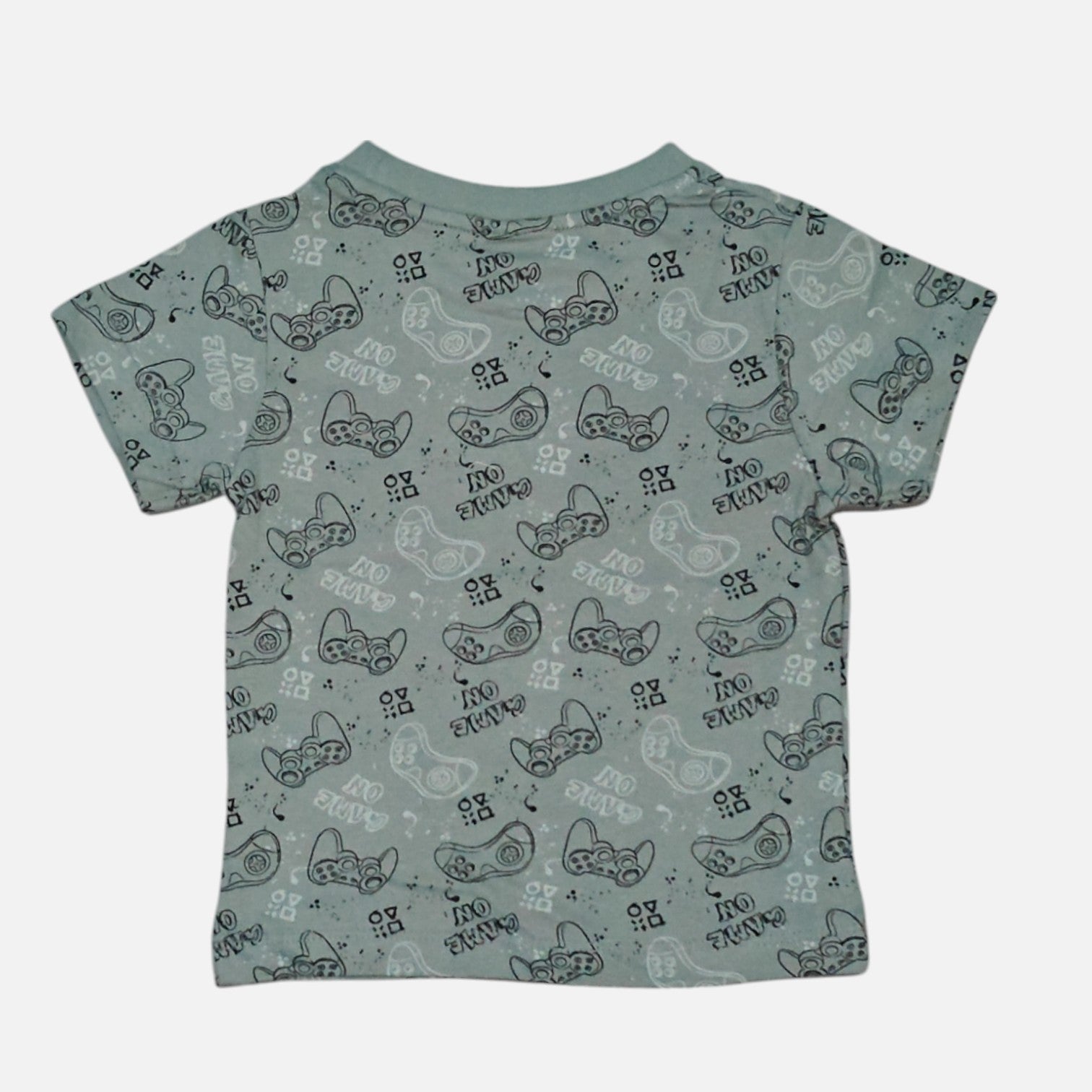- The green t-shirt features a delightful game console print, making it visually appealing. Its short sleeves and round neckline are practical and ensure comfort during wear.