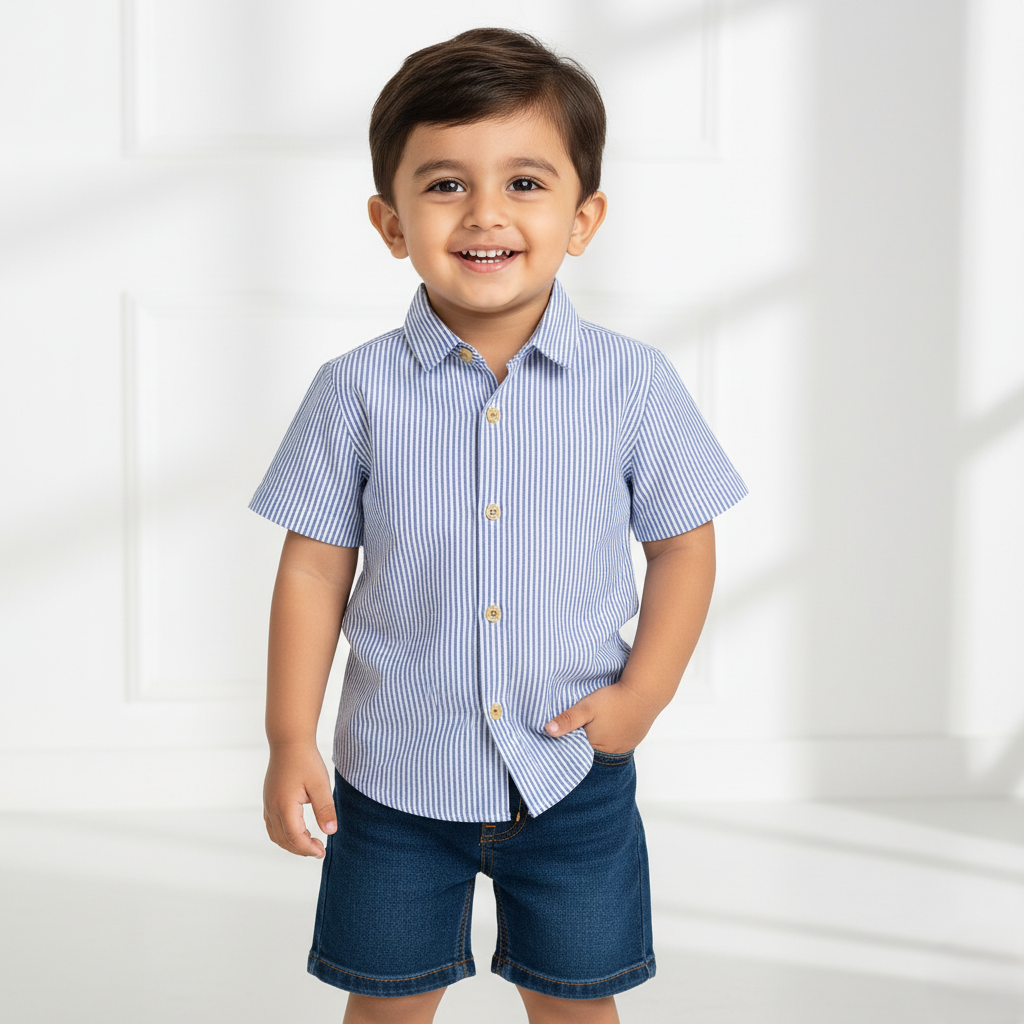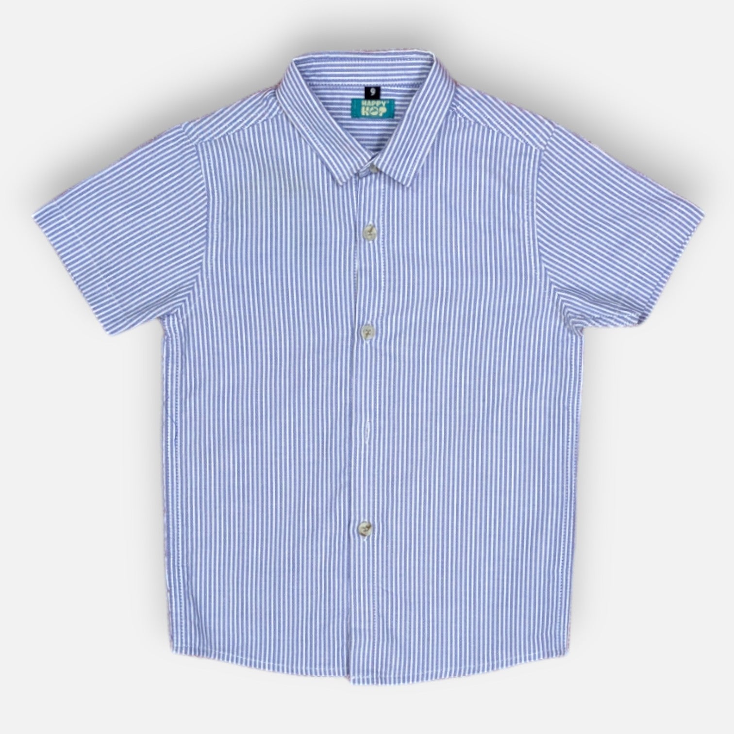 - This premium blue short-sleeved, button-up shirt features subtle vertical stripes and has a collar and a front closure with four buttons.