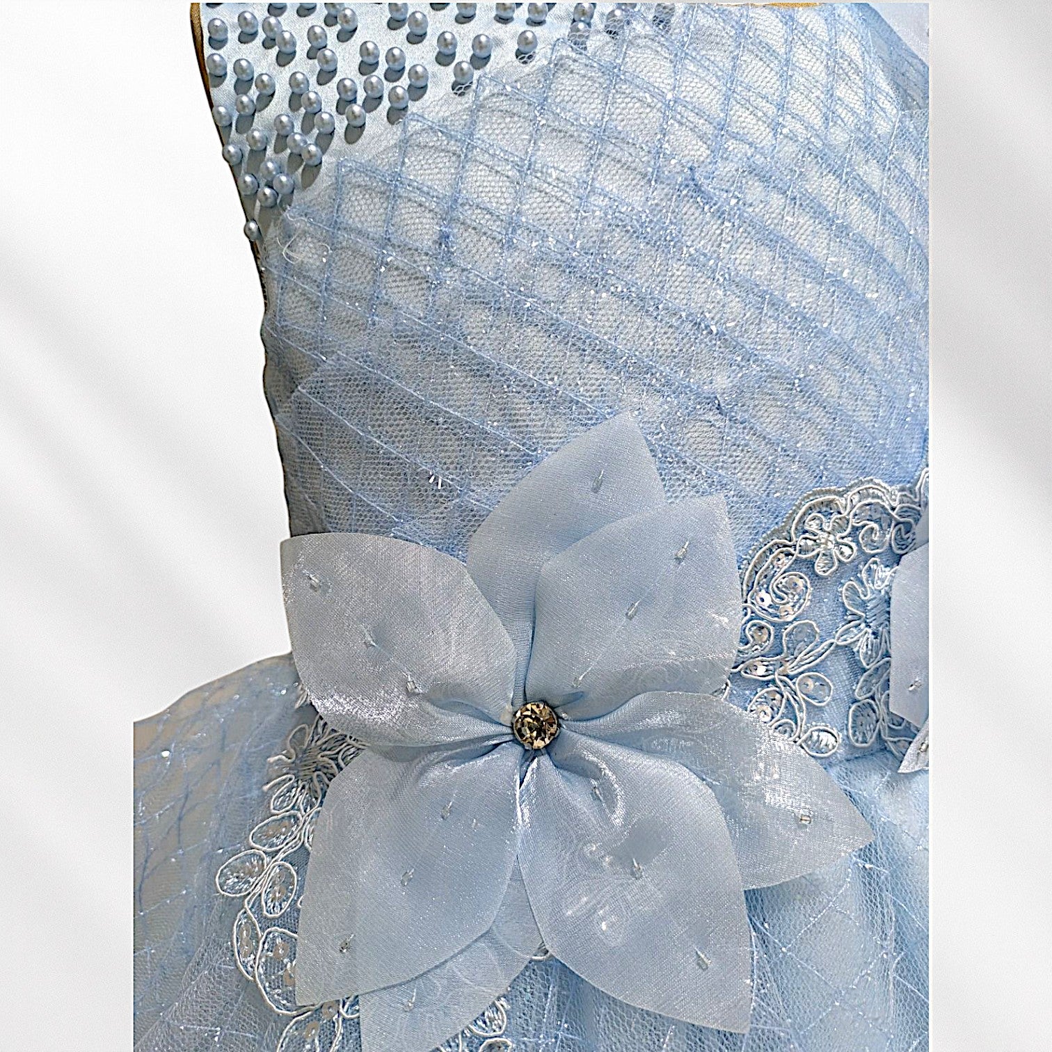 - A light blue princess dress features a sleeveless design with a round neckline. The bodice is adorned with a pattern of small, shiny embellishments on one side and a large fabric flower on the shoulder. The waistline is decorated with two large fabric flowers and intricate lace detailing. The skirt is multi-layered with a combination of soft, sheer fabrics and a net overlay, creating a voluminous and elegant look.