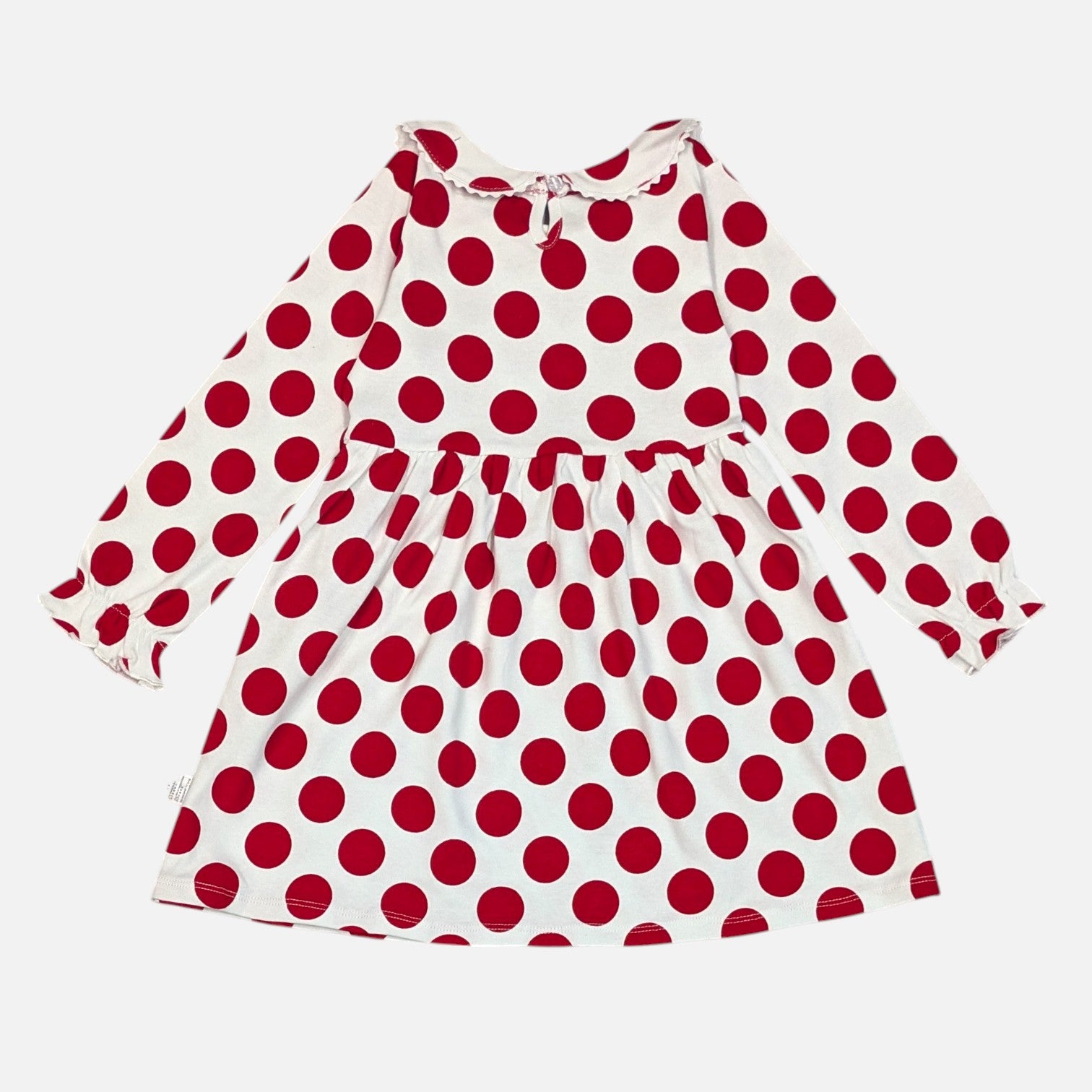 - The long-sleeved frock with a white base and pink polka dots printed on the fabric.