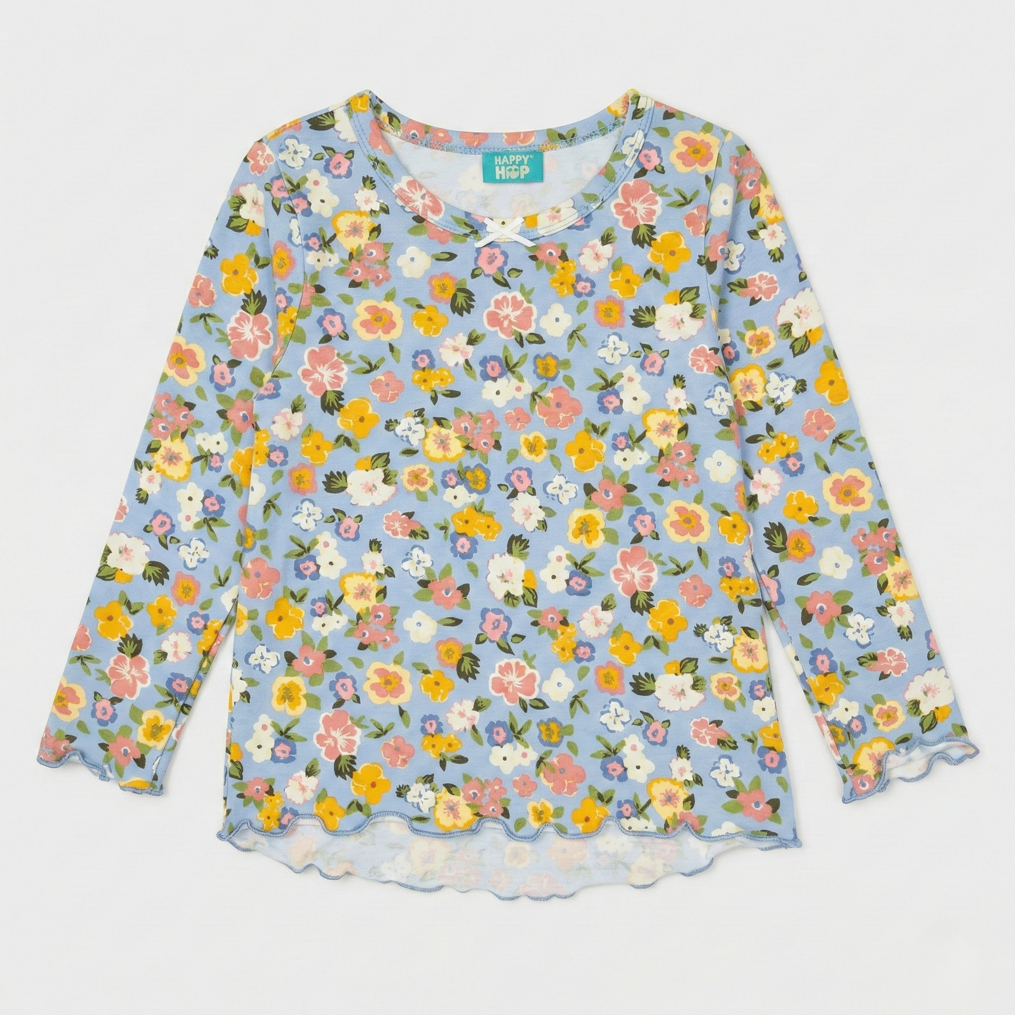 - Blue full-sleeve top with a calm floral print adds a sweet touch, while the easy pull-on neckline makes dressing quick and fuss-free for parents.