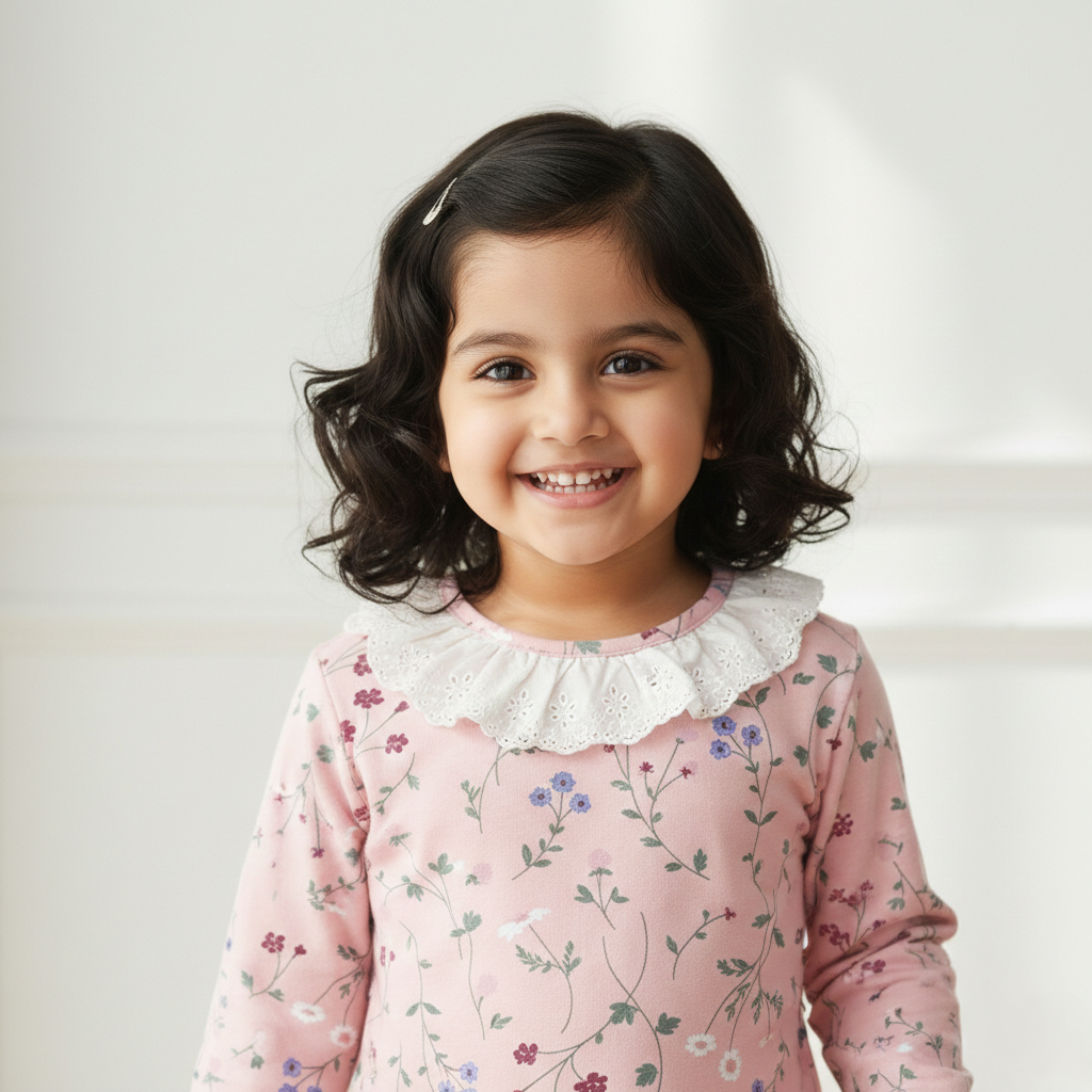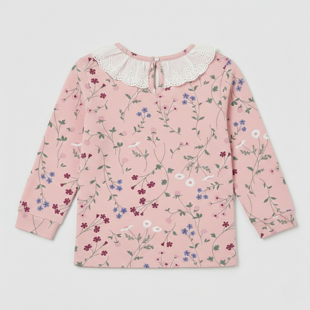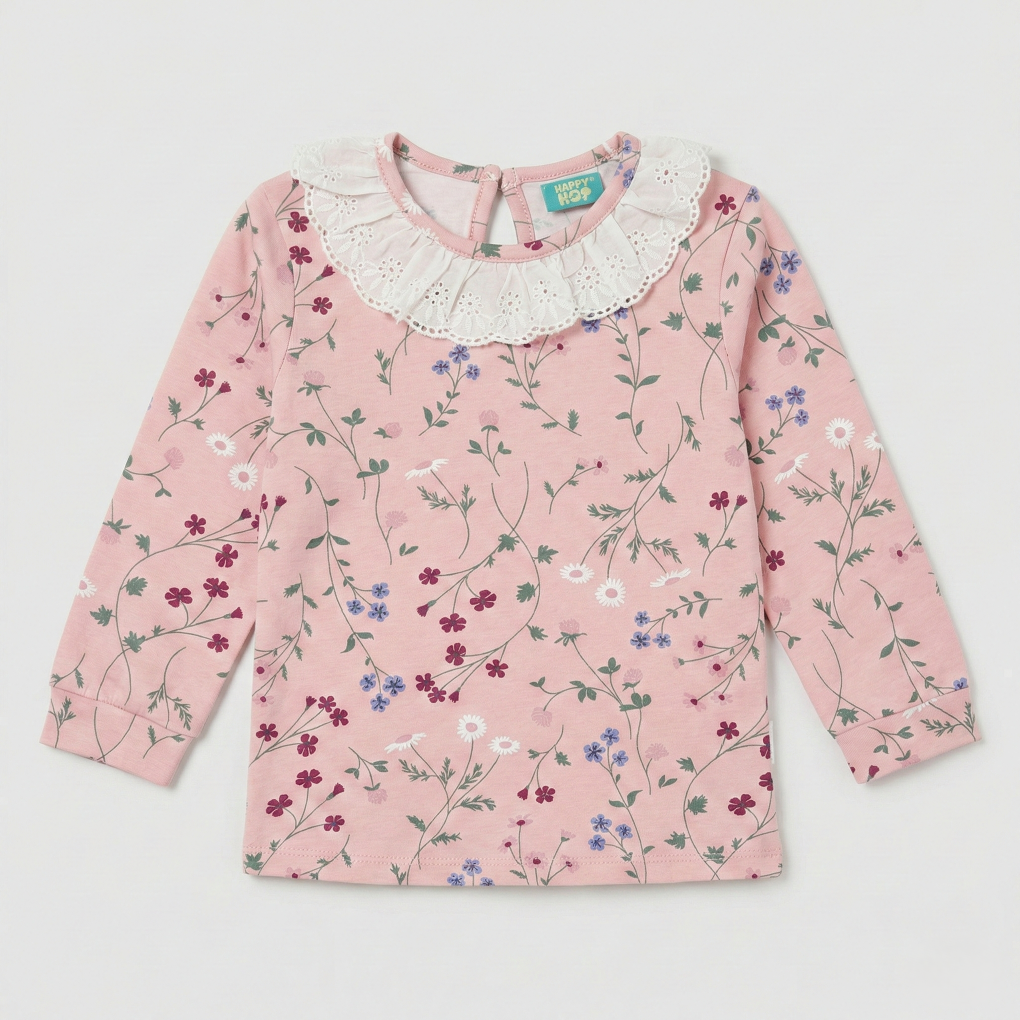 - Pink full-sleeve top with a elegant floral vine print — perfect for casual wear, playdates, and day outings.