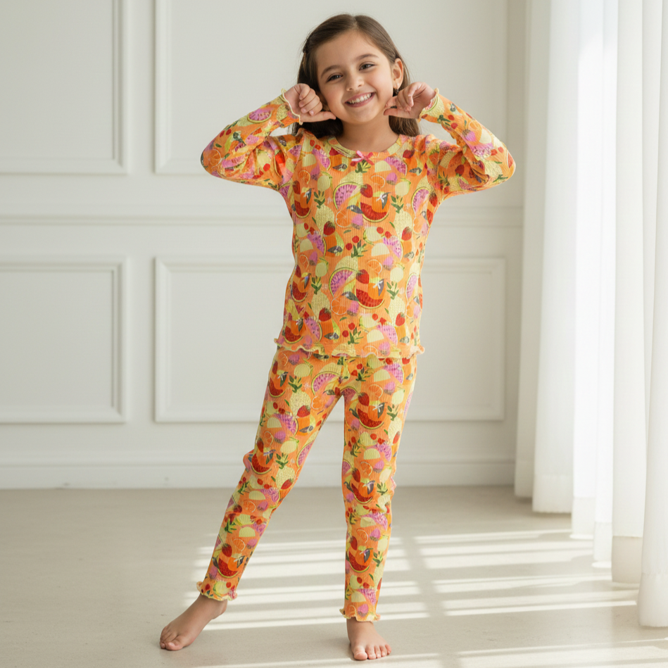 - This Orange co-ord set outfit consisting of a long-sleeved top and a pair of pants.