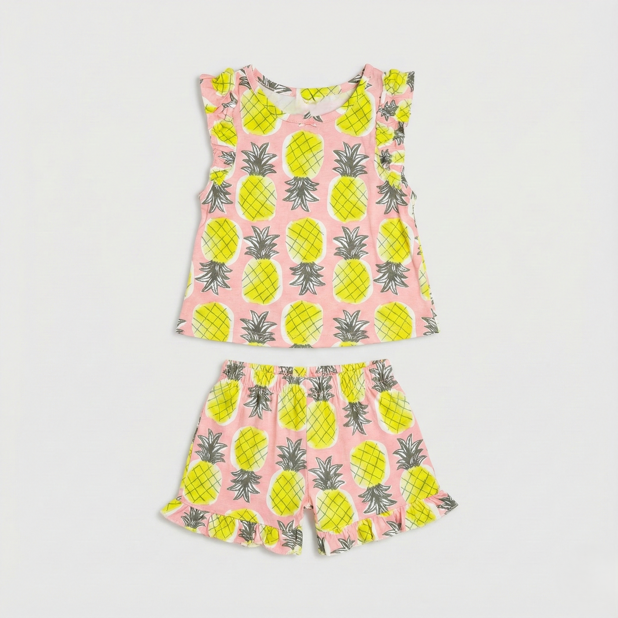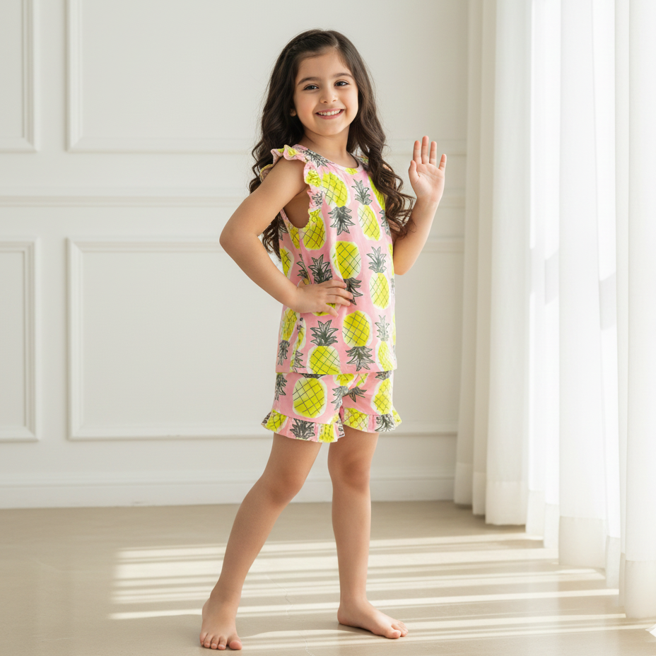 - The top boasts ruffled sleeves for added style, while the shorts come with an elastic waistband and ruffled hems, ensuring both comfort and ease of wear.
