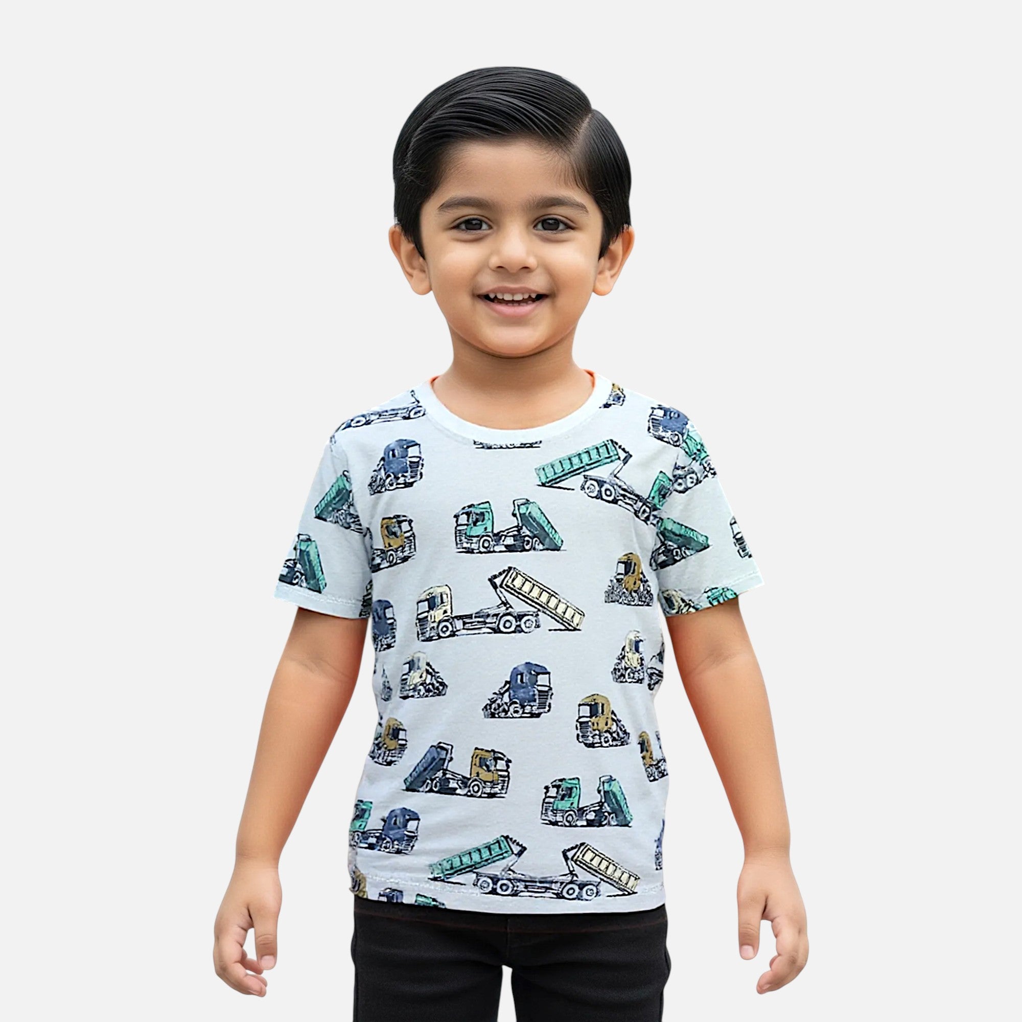 - The yellow t-shirt features a delightful truck print, making it visually appealing. Its short sleeves and round neckline are practical and ensure comfort during wear.