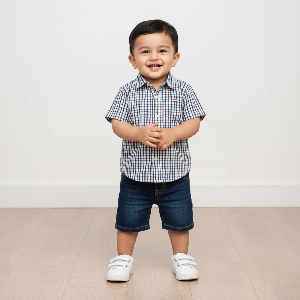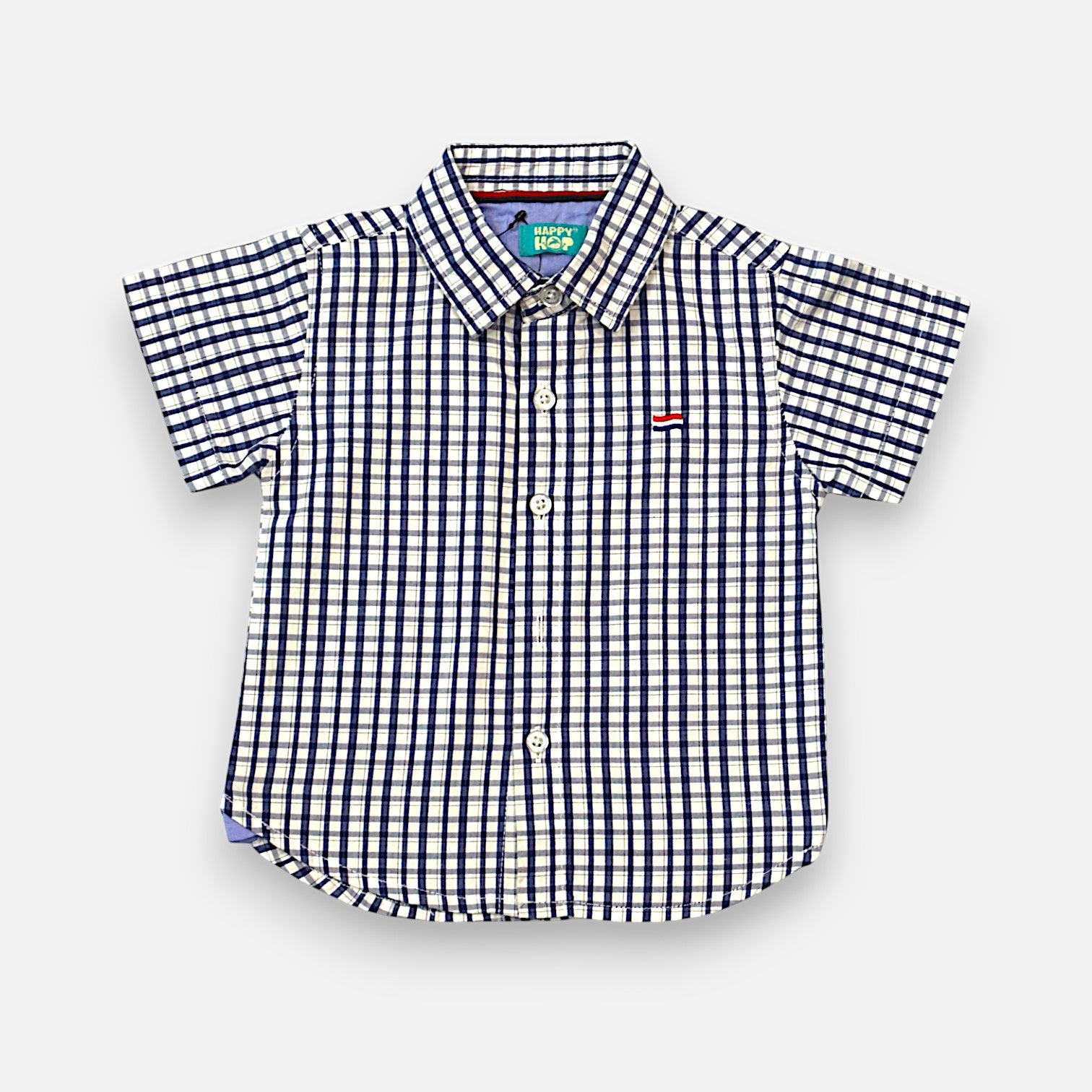 - A premium short-sleeved, button-up shirt with a charming navy blue and white checkered pattern. The shirt features a collar and has four white buttons running down the front.