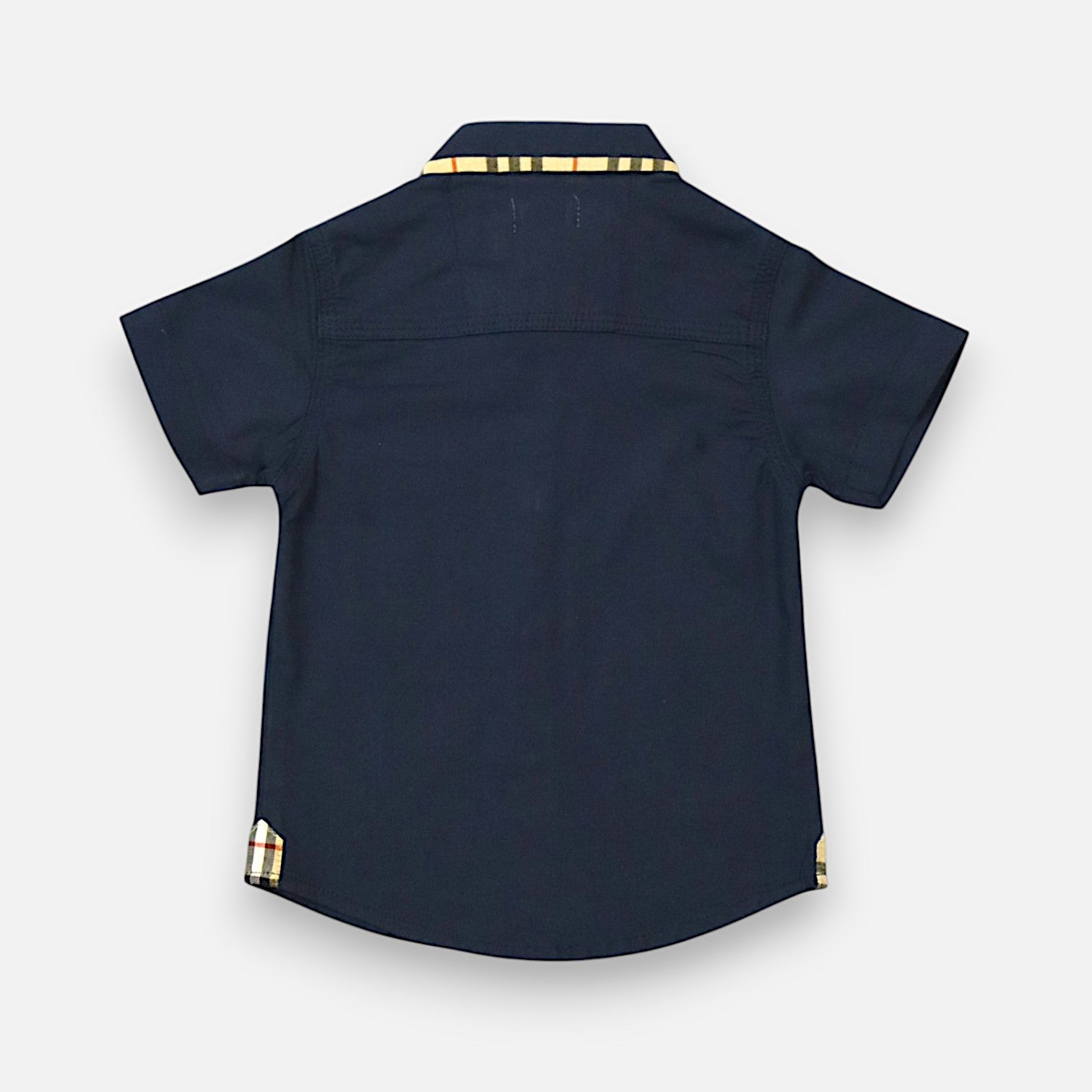 - This premium navy blue short-sleeved, button-up shirt features solid single tone colour and has a collar and a front closure with four buttons.