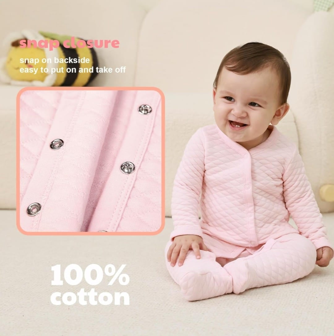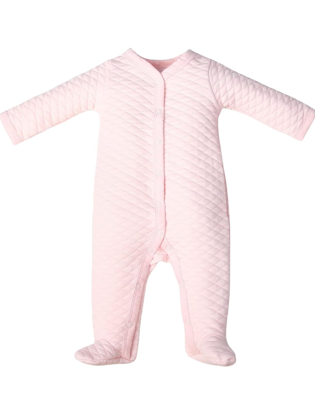 - The long-sleeved baby rompers featuring footed legs and a stylish diamond quilted pattern around the fabric.