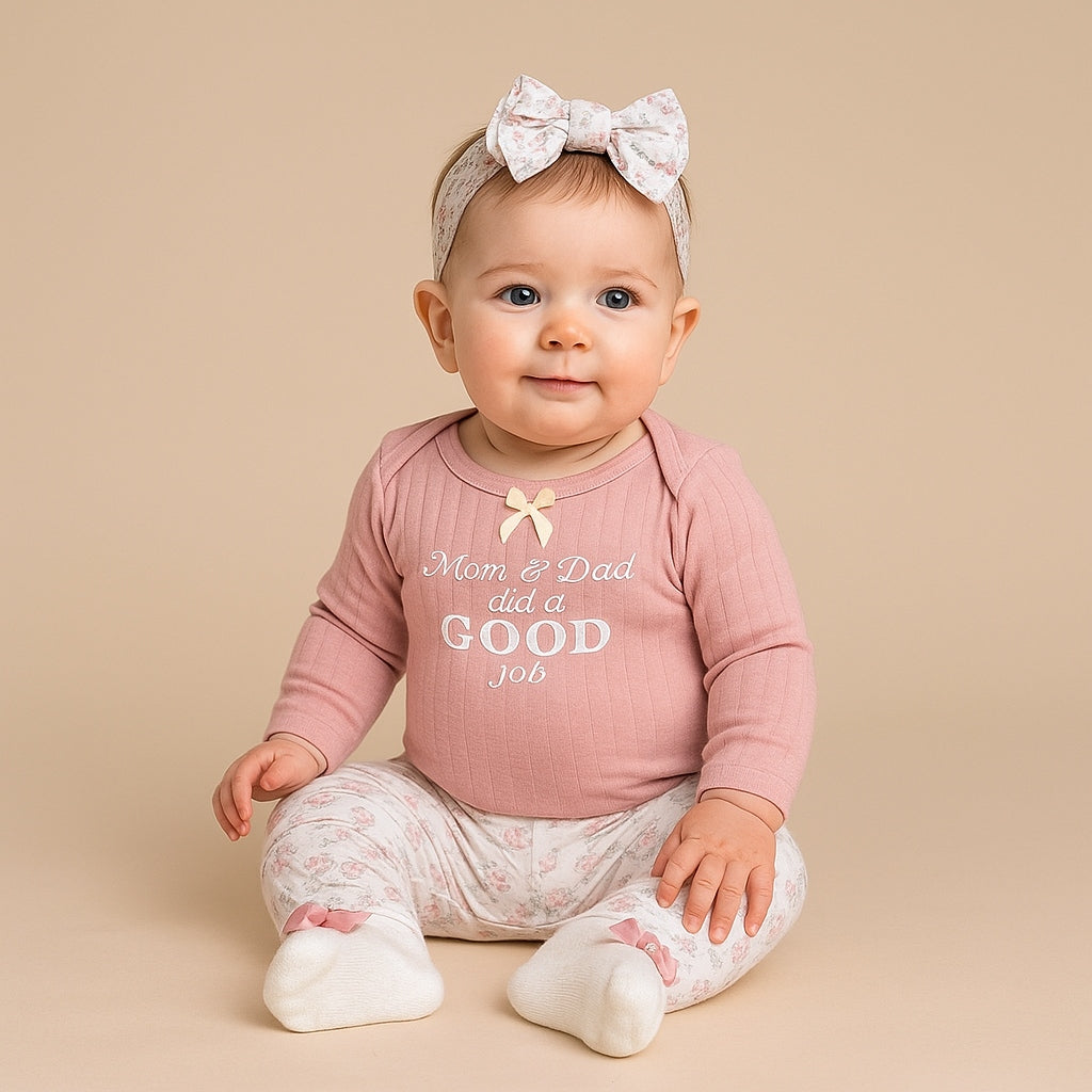 - The long-sleeved baby romper comes as part of a set, including matching leggings, a headband, and socks, all perfectly designed to keep your baby comfortable and looking adorable with its own delightful pattern.