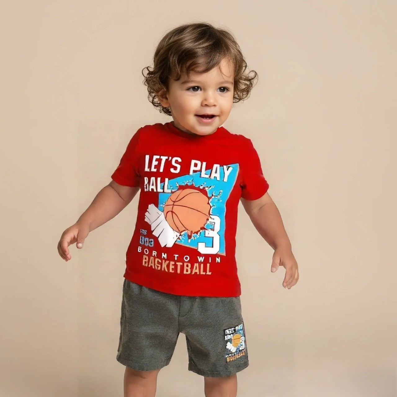 - This Boy’s outfit set includes a playful red t-shirt with basketball prints, paired with grey shorts featuring a matching design and a handy drawstring at the waist.