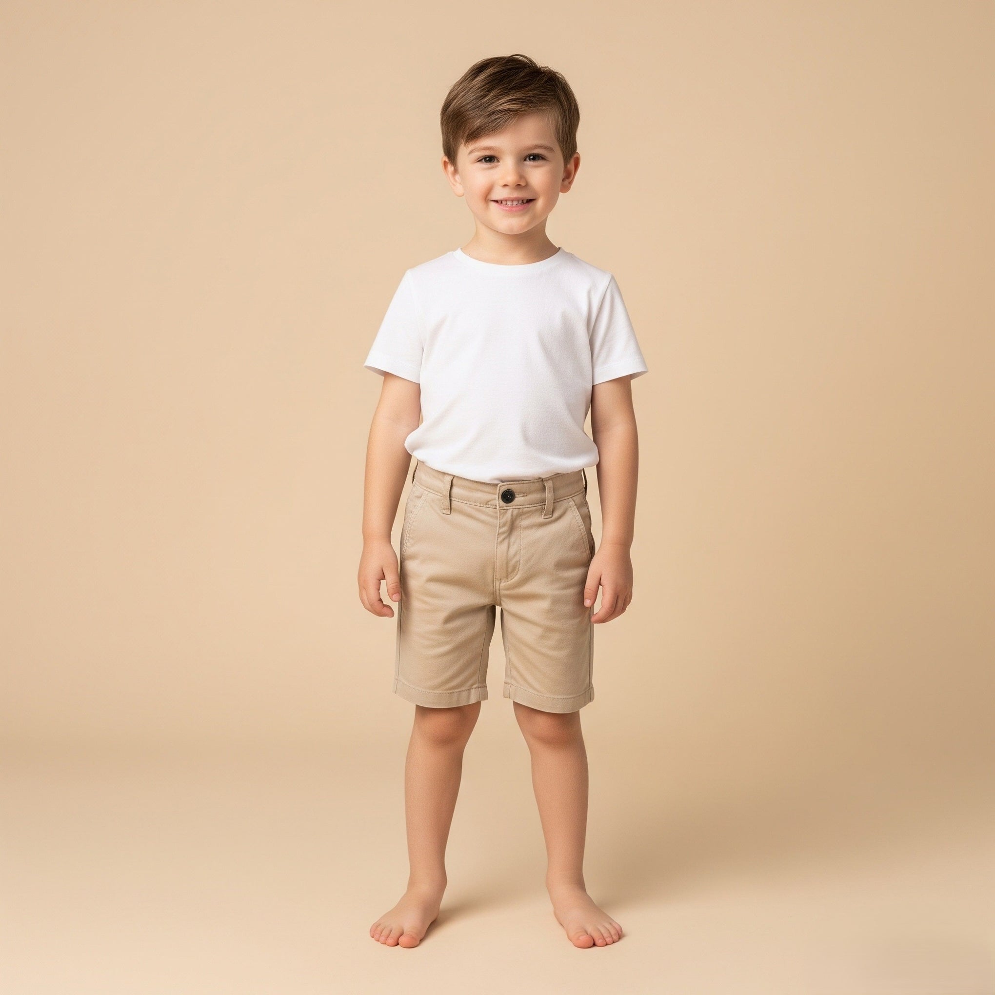 - Beige chino, feature a metallic button at the waistband, having two front pockets.
