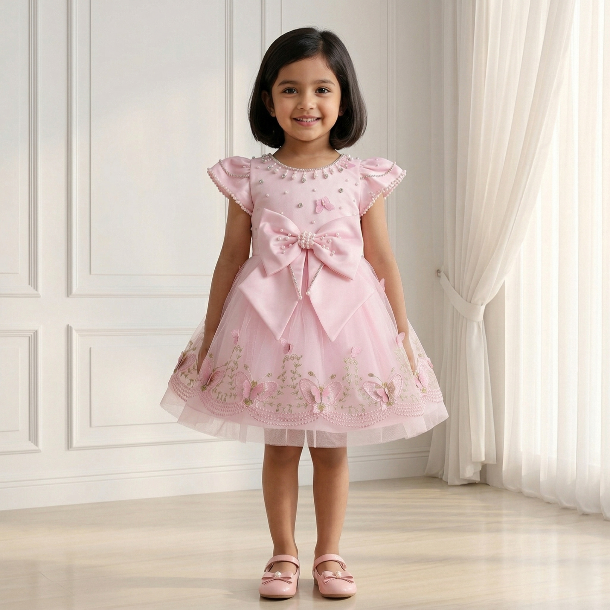 - Elegant blush pink party dress with delicate butterfly embroidery and pearl detailing for a dreamy, fairy-tale look. Statement satin bow at the front adds a charming, picture-perfect finish. Soft layered net skirt creates beautiful volume and a graceful silhouette. Intricate floral and butterfly accents along the hem enhance the premium feel.