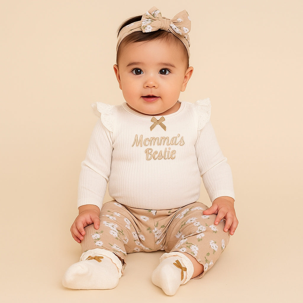 - The long-sleeved baby romper comes as part of a set, including matching leggings, a headband, and socks, all perfectly designed to keep your baby comfortable and looking adorable with its own delightful pattern.