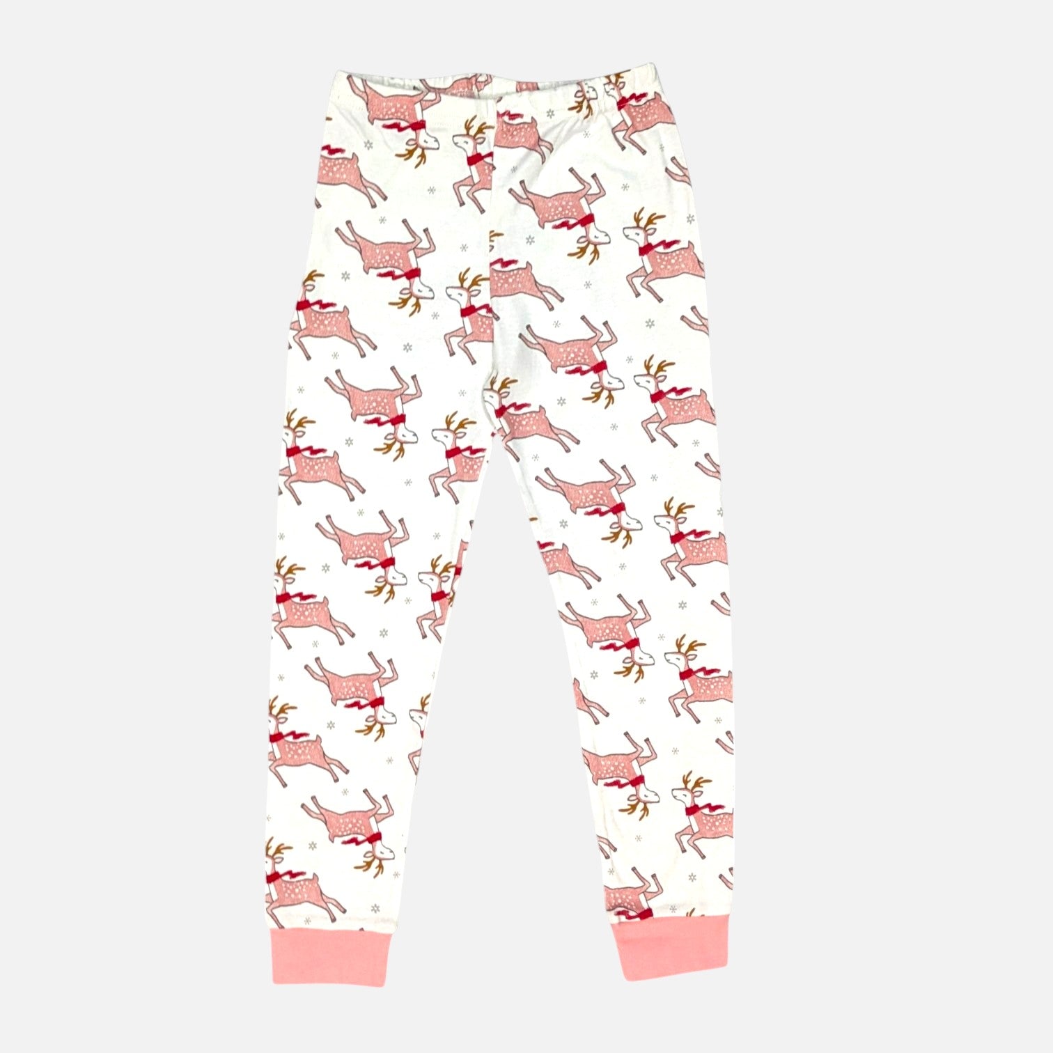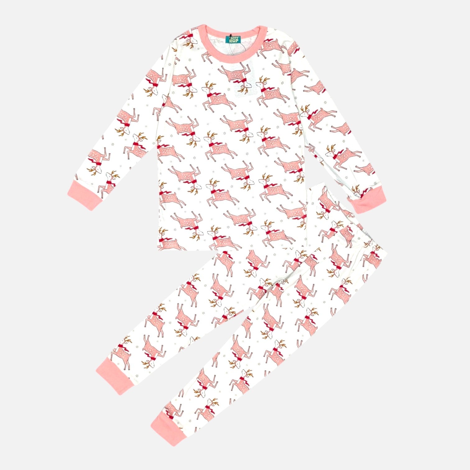 - The set features are predominantly white with pink cuffs on the sleeves, neckline, and pant legs. The fabric features a repeating pattern of reindeer wearing red scarves, which adds a festive and playful touch to the design
