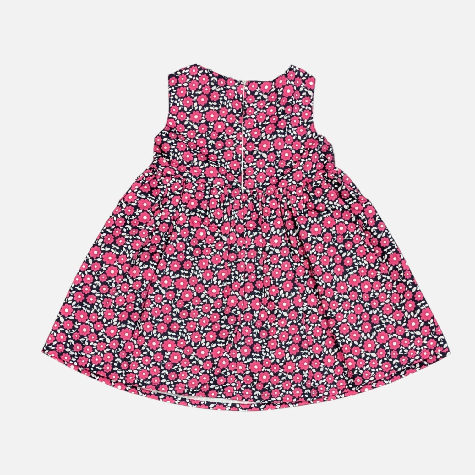 - A sleeveless knee-length blue frock designed features a vibrant floral pattern with pink flowers and white centers on a dark background.