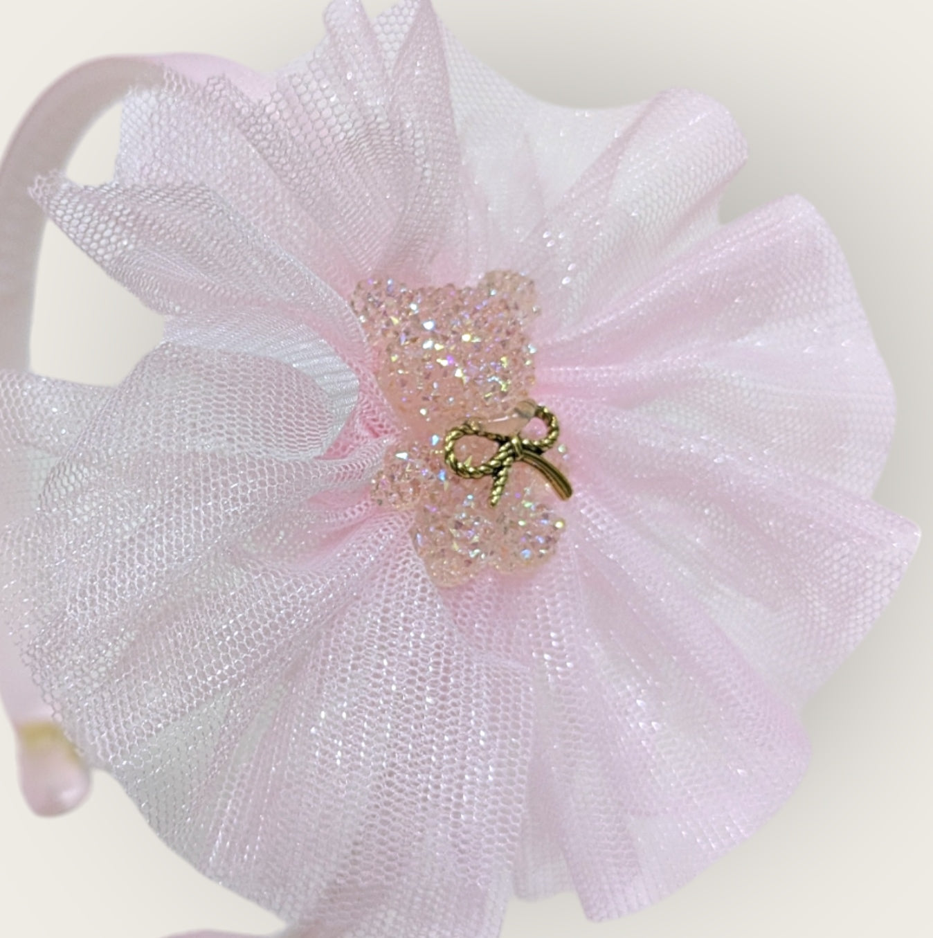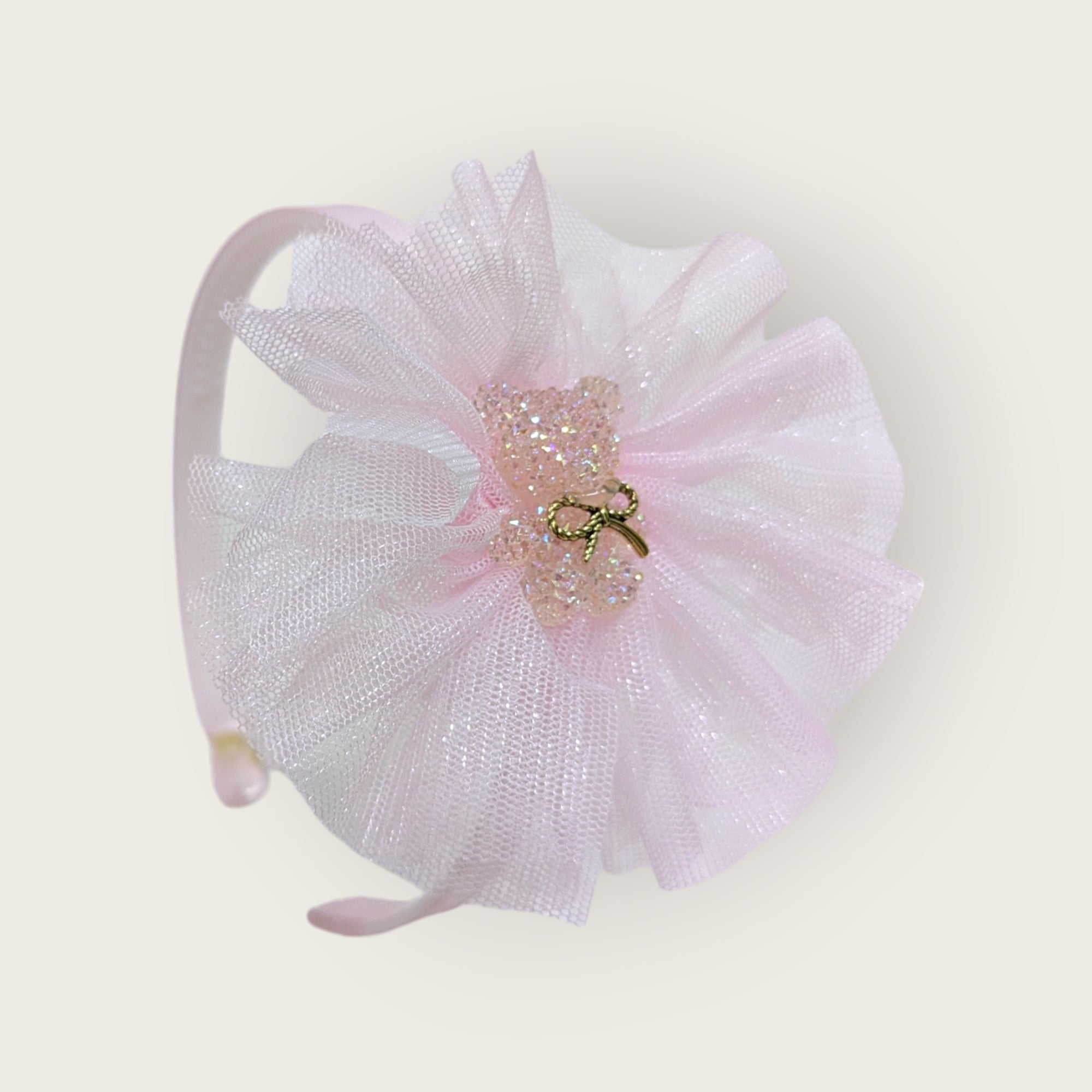 Elegant Pink hairband with a stylish teddy netted on flower, perfect for weddings, proms, or any special occasion.