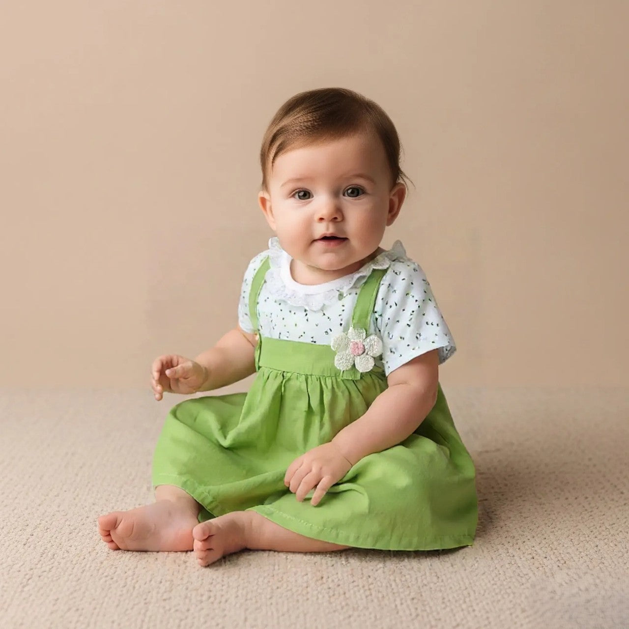 - This adorable baby dress set includes a white short-sleeved top with a small floral pattern in yellow and green. Attached to the top is a green pinafore-style dress with two shoulder straps. The dress has a decorative element in the center, which is a white flower.