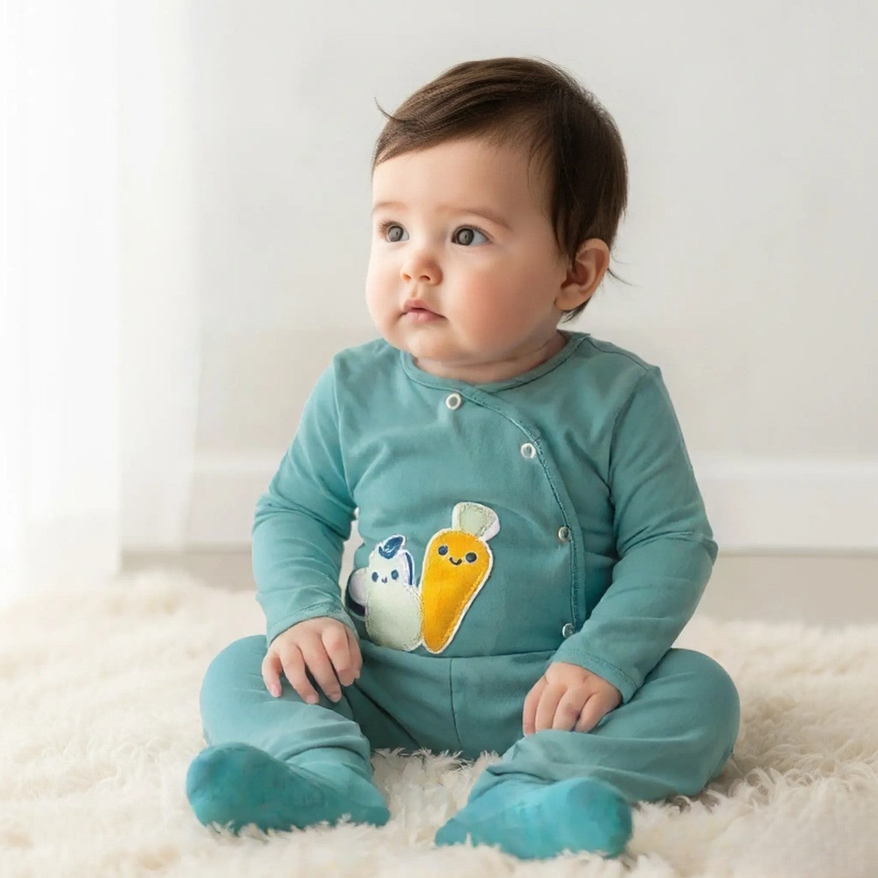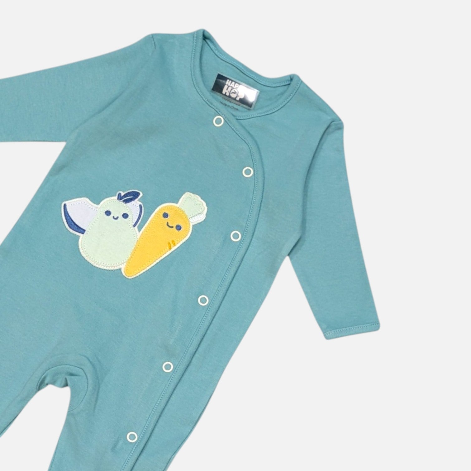 - The long-sleeved baby rompers featuring footed legs and an adorable embroidered design of a cheerful white radish and a sunny yellow carrot.
