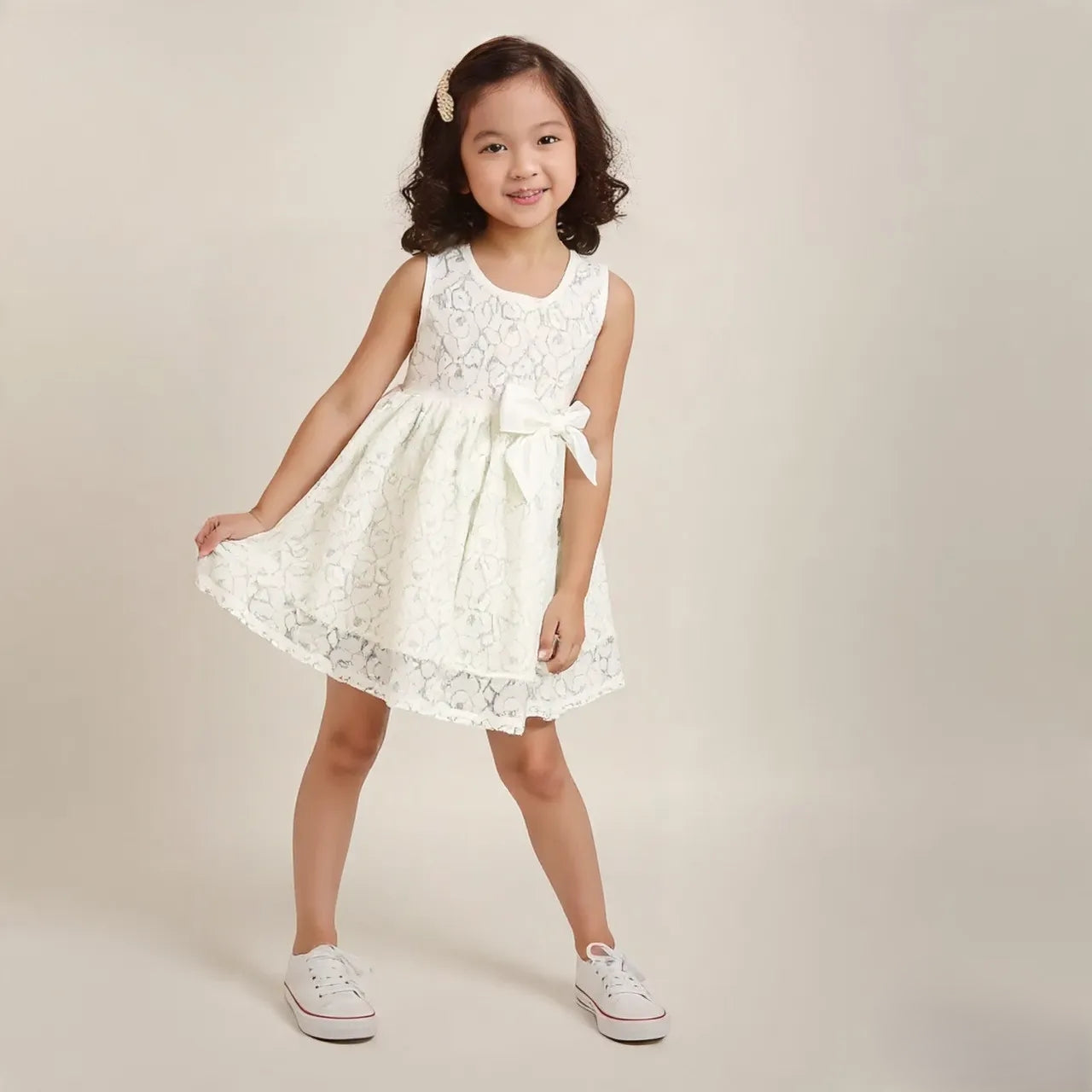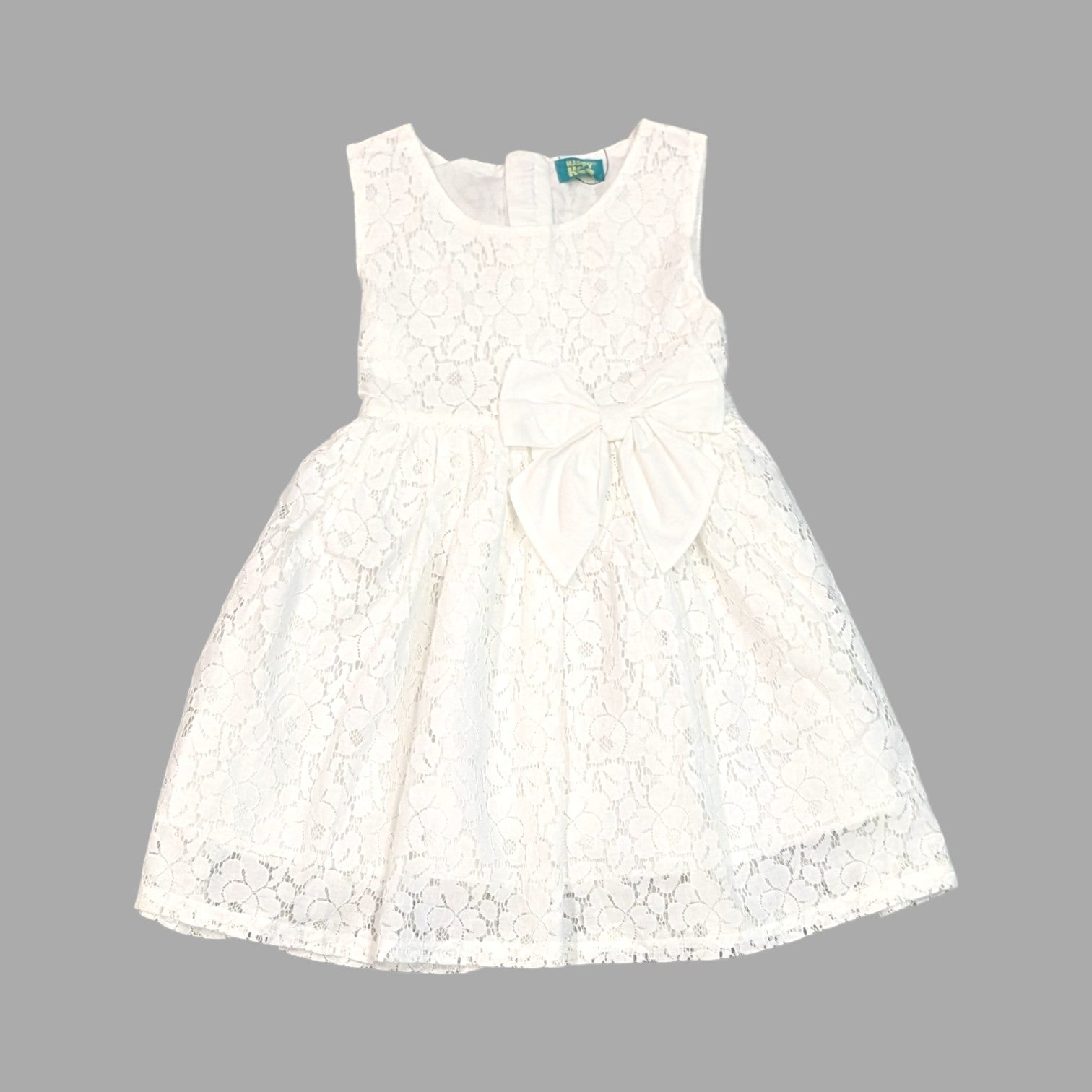 - A white-coloured, sleeveless frock features a lace overlay with a floral pattern and a large, matching peach bow on the left side of the waist.