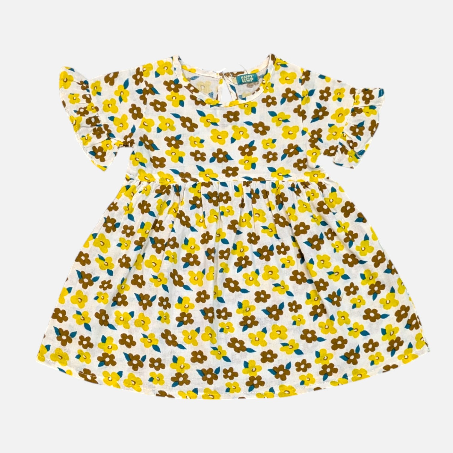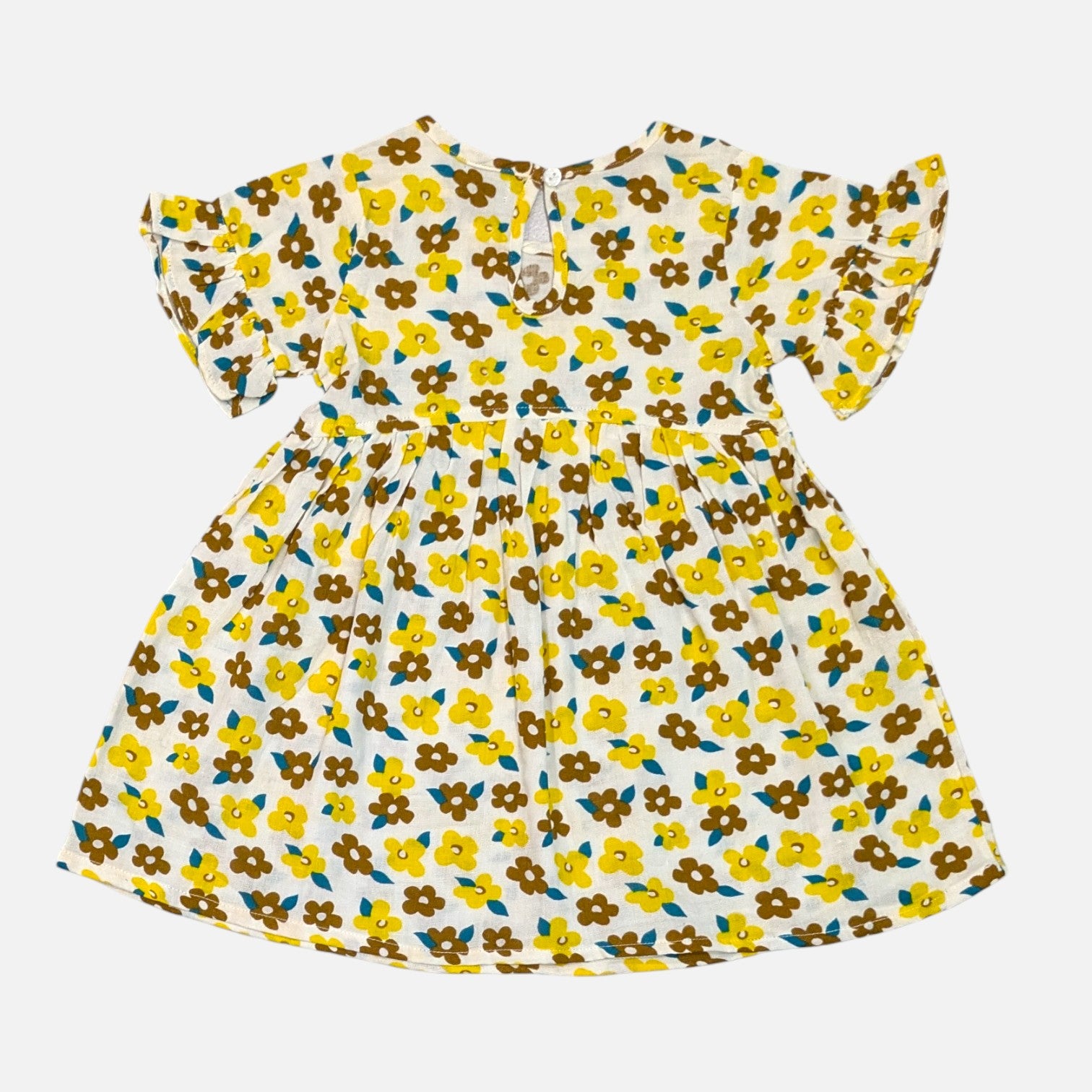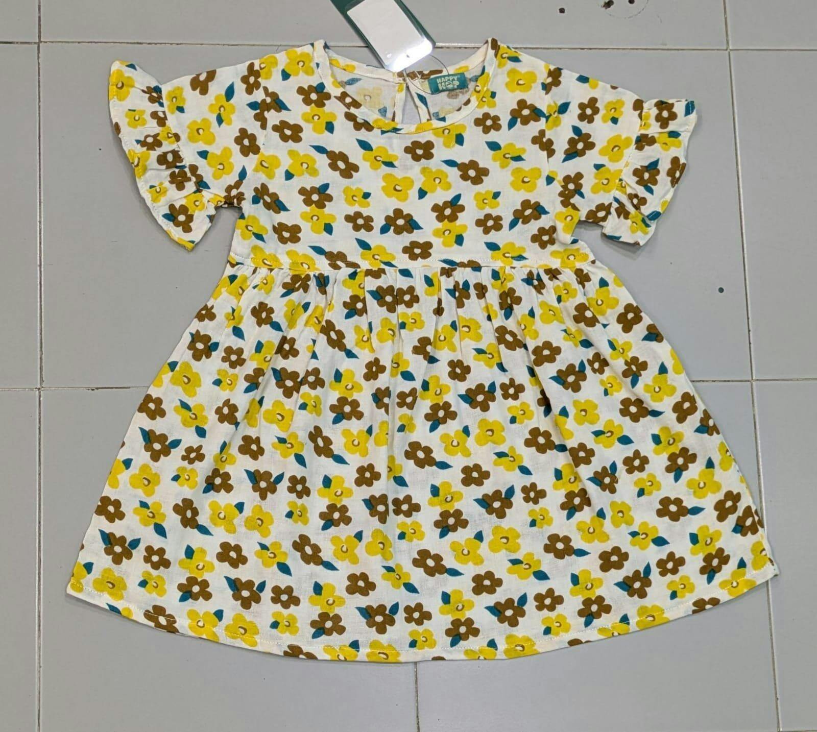 - A short-sleeves knee-length white frock designed features a vibrant floral pattern. The fabric is white, adorned with a delightful mix of yellow, brown, and blue flowers.
