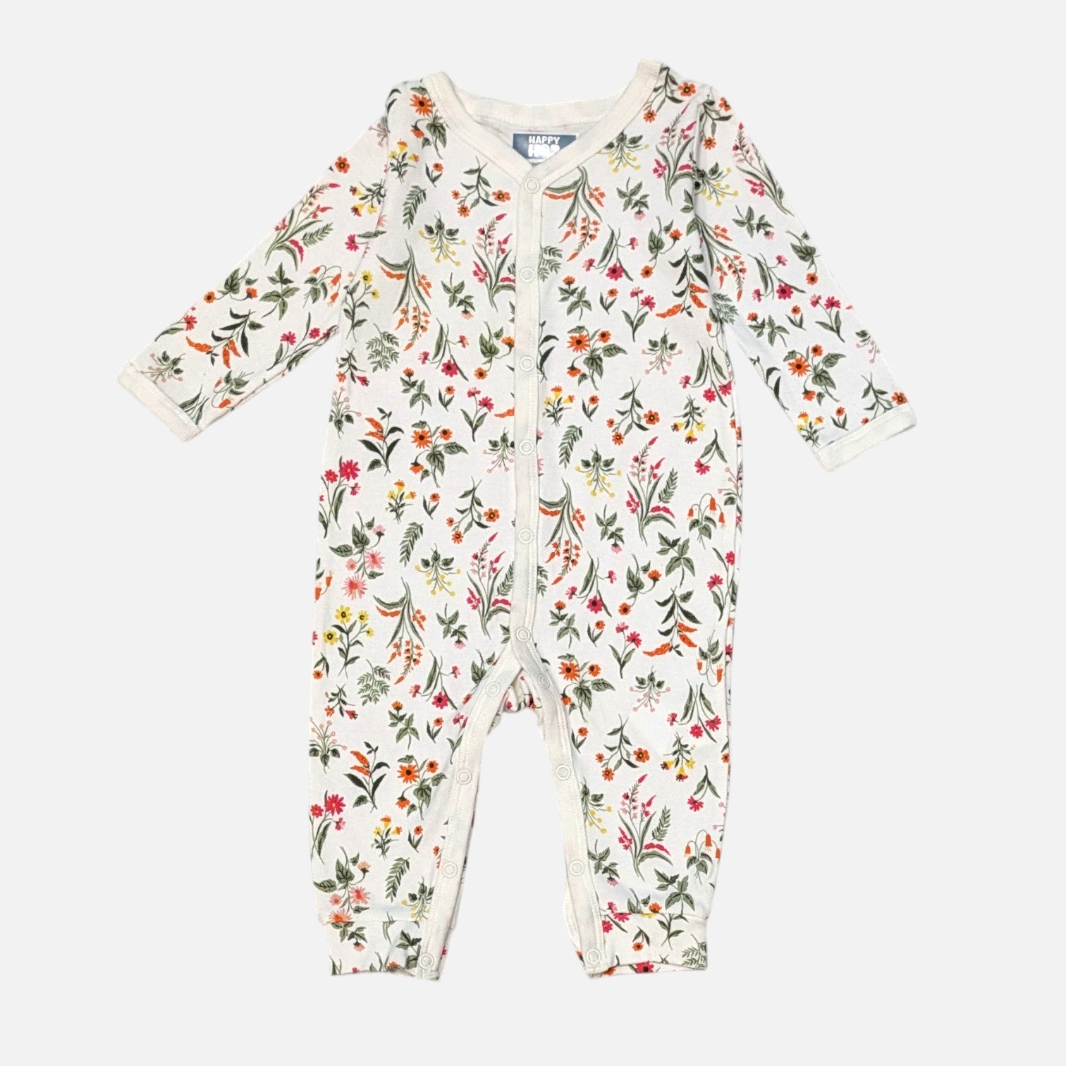- The white long-sleeved baby rompers featuring footed legs and an adorned with various elements such as leaves and flowers.