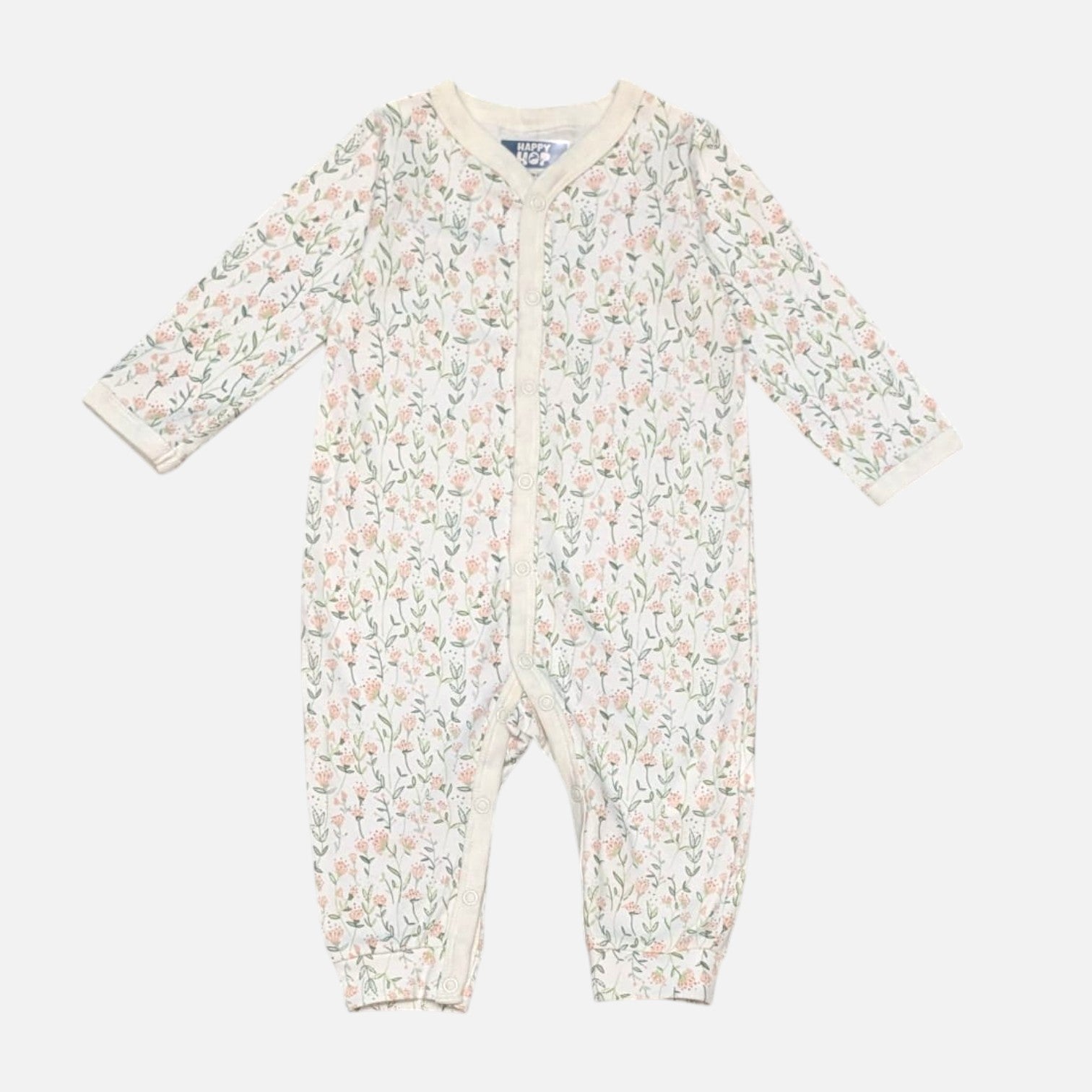 - The pink long-sleeved baby rompers featuring footed legs and an beautiful delicate floral pattern in pastel colors of pink and green on a pristine white background.