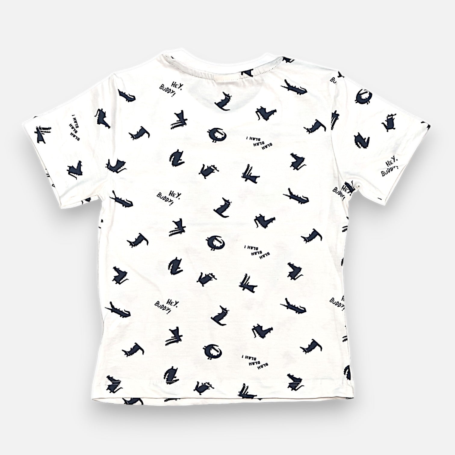- The white t-shirt features a delightful dino print, making it visually appealing. Its short sleeves and round neckline are practical and ensure comfort during wear.