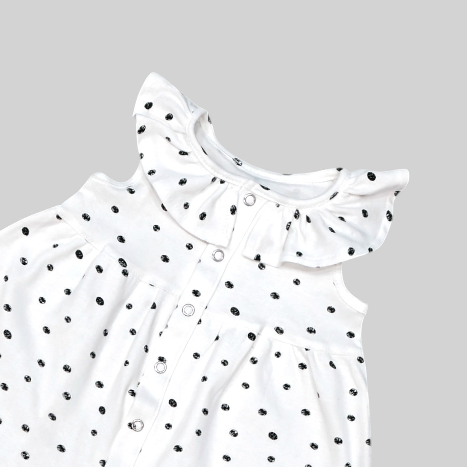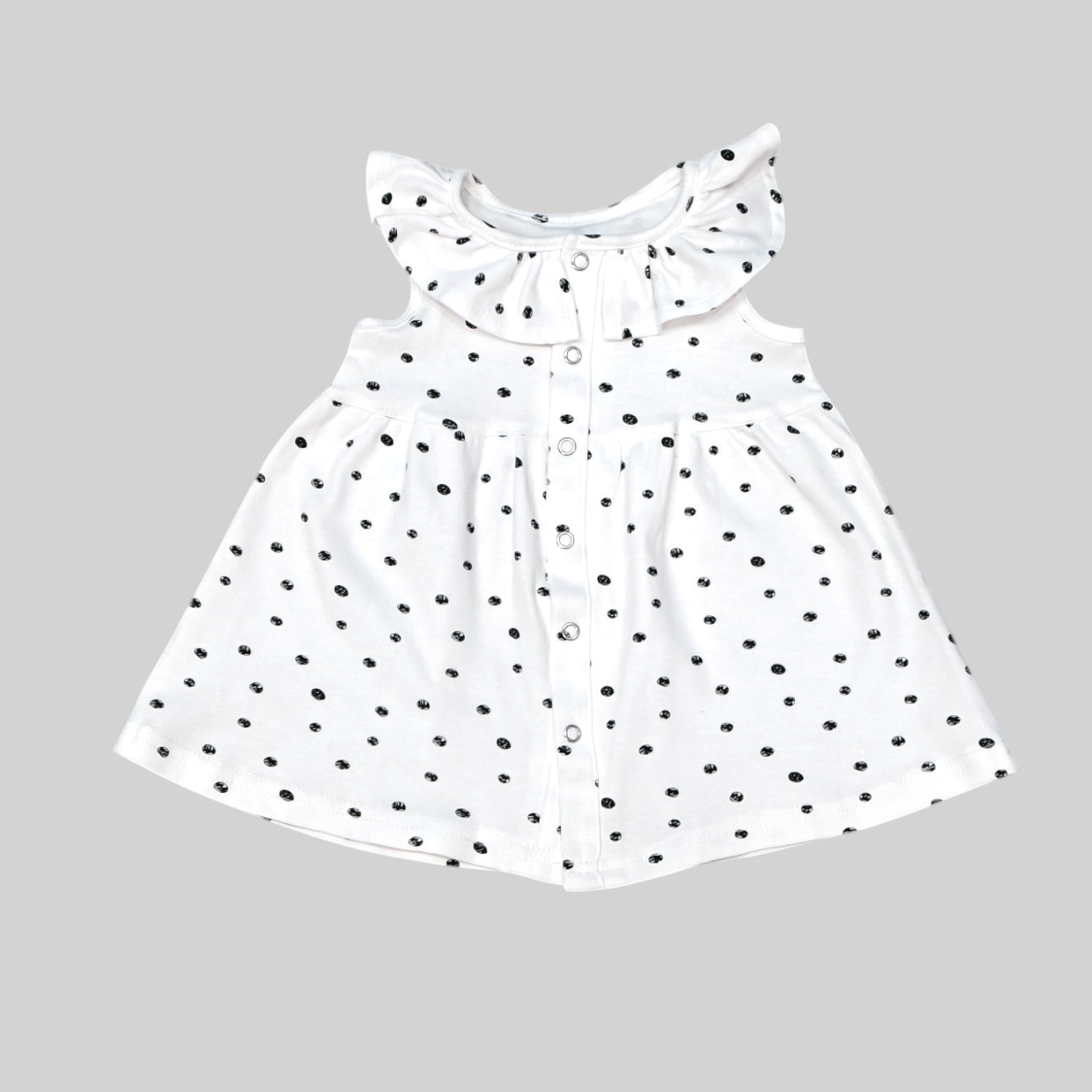 - This adorable sleeveless frock is perfectly crafted with a white base, the frock features a decorated with small black polka dots evenly distributed across the fabric.