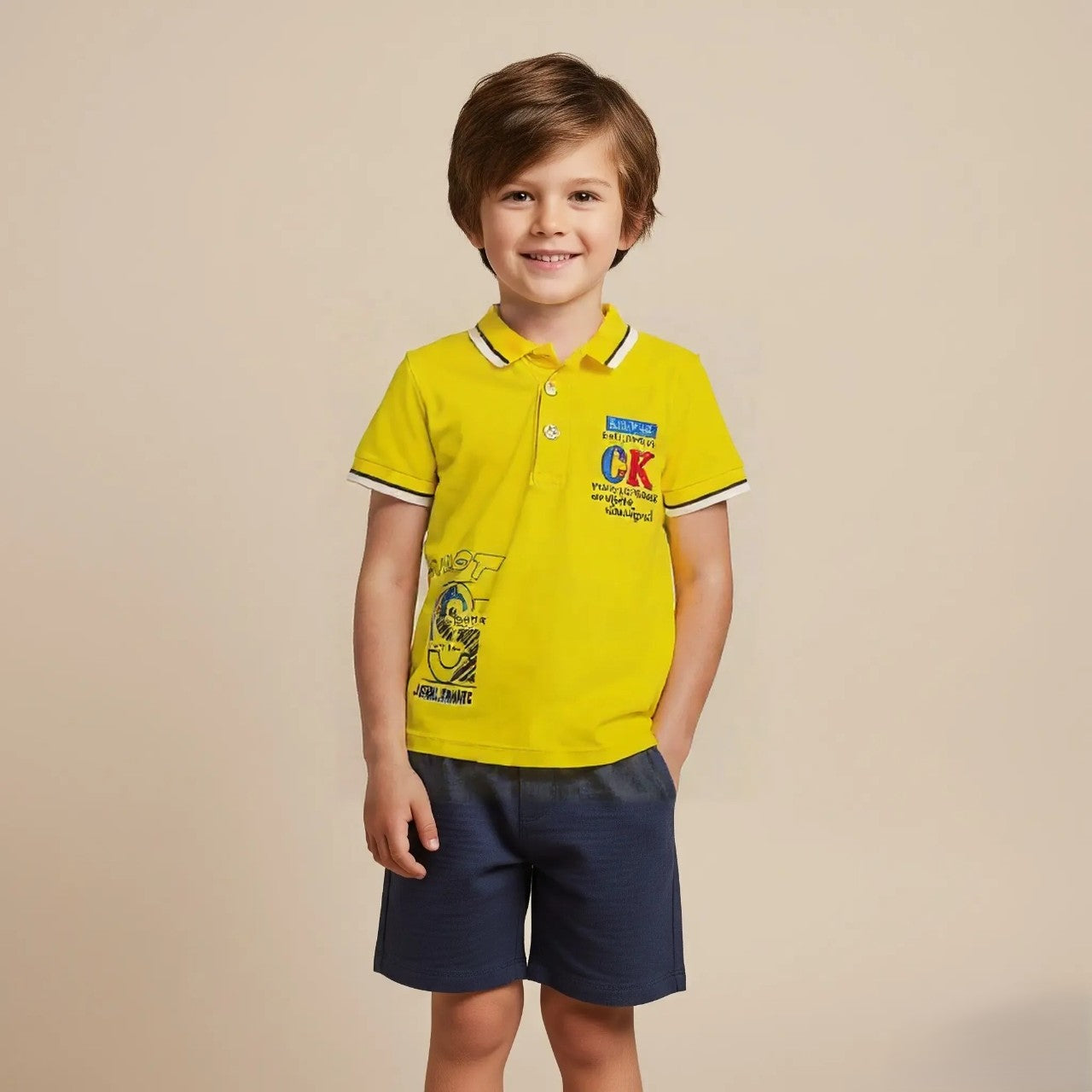 - A boy yellow short-sleeved polo shirt with a button placket featuring three buttons. The shirt has a collar and sleeve cuffs with black and white stripes. The shirt is adorned with various printed designs and text.